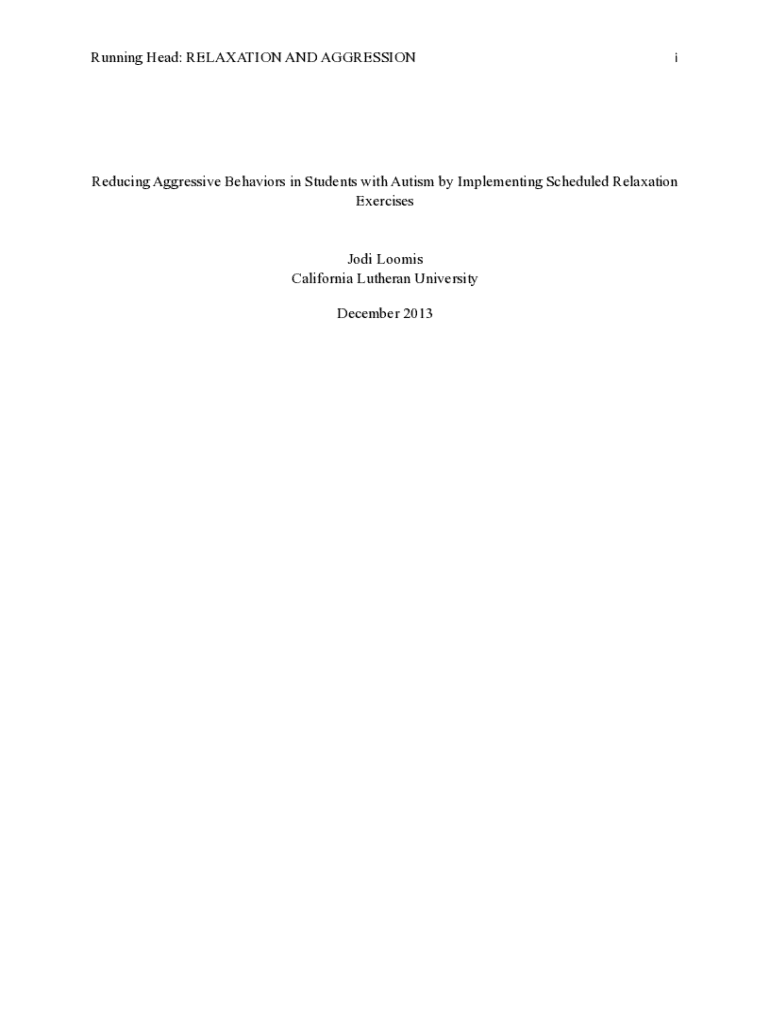 Running Head: RELAXATION AND AGGRESSIONiReducing Aggressive Behaviors in Students with Autism by Implementing Scheduled Relaxation ExercisesJodi Loomis California Lutheran University December 2013RELAXATION