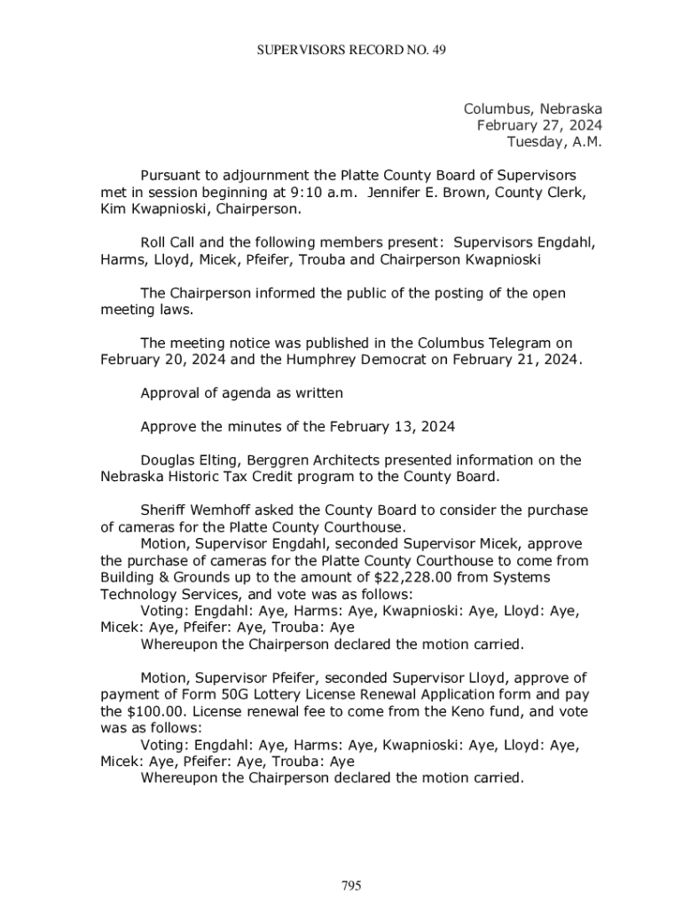 SUPERVISORS RECORD NO. 49Columbus, Nebraska February 27, 2024 Tuesday, A.M. Pursuant to adjournment the Platte County Board of Supervisors met in session beginning at 9:10 a.m. Jennifer E. Brown,