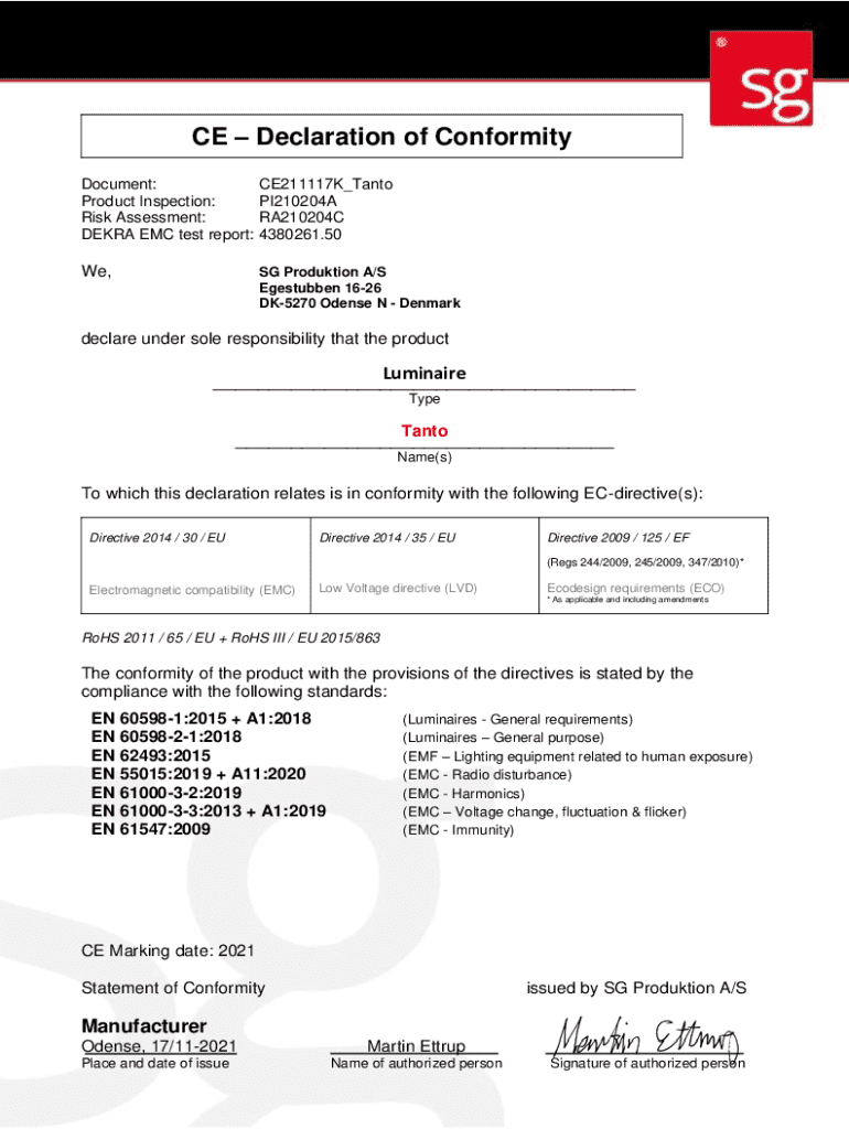 CE Declaration of Conformity Document: Product Inspection: Risk Assessment: DEKRA EMC test report:CE211117K_Tanto PI210204A RA210204C 4380261.50We,SG Produktion A/S Egestubben 1626 DK5270 Odense N