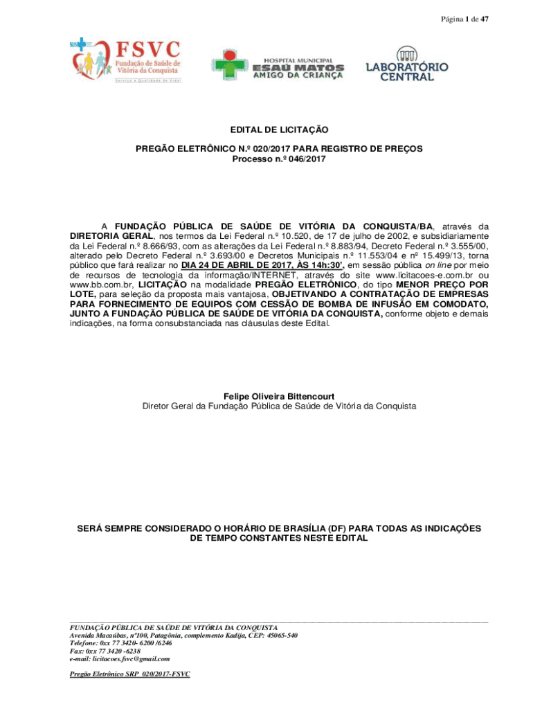Pgina 1 de 47EDITAL DE LICITAO PREGO ELETRNICO N. 020/2017 PARA REGISTRO DE PREOS Processo n. 046/2017A FUNDAO PBLICA DE SADE DE VITRIA DA CONQUISTA/BA, atravs da DIRETORIA GERAL, nos termos da Lei