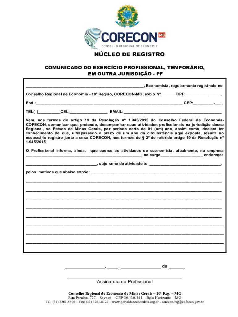 NCLEO DE REGISTRO COMUNICADO DO EXERCCIO PROFISSIONAL, TEMPORRIO, EM OUTRA JURISDIO PF ___, Economista, regularmente registrado no Conselho Regional de Economia 10 Regio, CORECONMG, sob o N___CPF:___,
