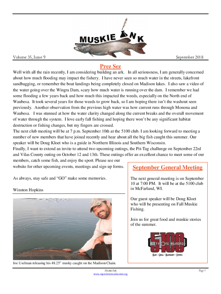 Volume 35, Issue 9September 2018Prez Sez Well with all the rain recently, I am considering building an ark. In all seriousness, I am generally concerned about how much flooding may impact the fishery.