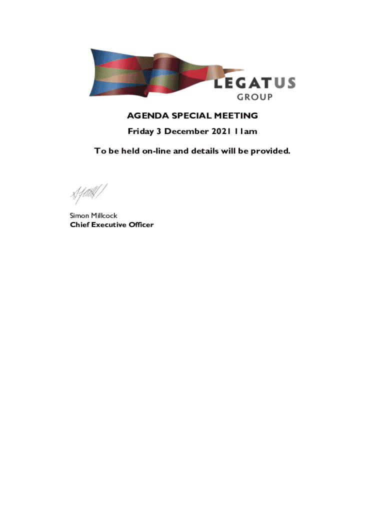 AGENDA SPECIAL MEETING Friday 3 December 2021 11am To be held online and details will be provided.Simon Millcock Chief Executive OfficerVISION The Central Local Government Region (Legatus Group) is