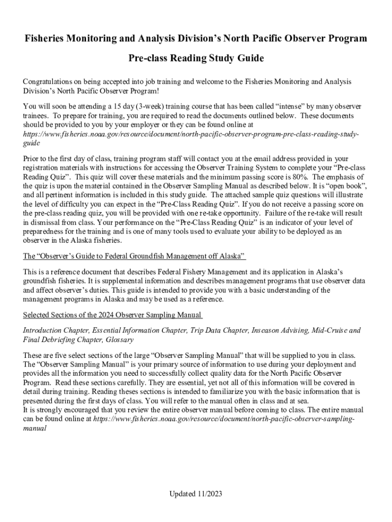 Fisheries Monitoring and Analysis Divisions North Pacific Observer Program Preclass Reading Study Guide Congratulations on being accepted into job training and welcome to the Fisheries Monitoring