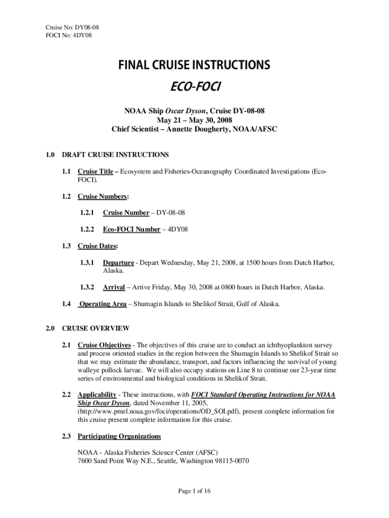 Cruise No: DY0808 FOCI No: 4DY08NOAA Ship Oscar Dyson, Cruise DY0808 May 21 May 30, 2008 Chief Scientist Annette Dougherty, NOAA/AFSC 1.0DRAFT CRUISE INSTRUCTIONS 1.1Cruise Title Ecosystem and FisheriesOceanography
