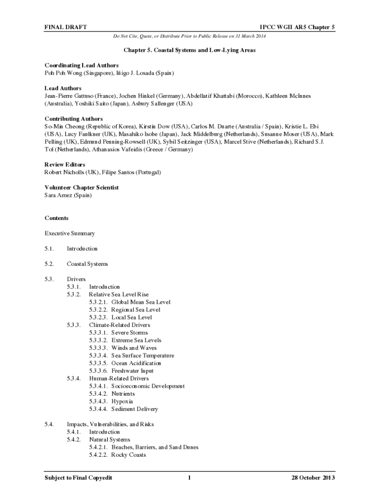 FINAL DRAFTIPCC WGII AR5 Chapter 5 Do Not Cite, Quote, or Distribute Prior to Public Release on 31 March 2014Chapter 5. Coastal Systems and LowLying Areas Coordinating Lead Authors Poh Poh Wong (Singapore),