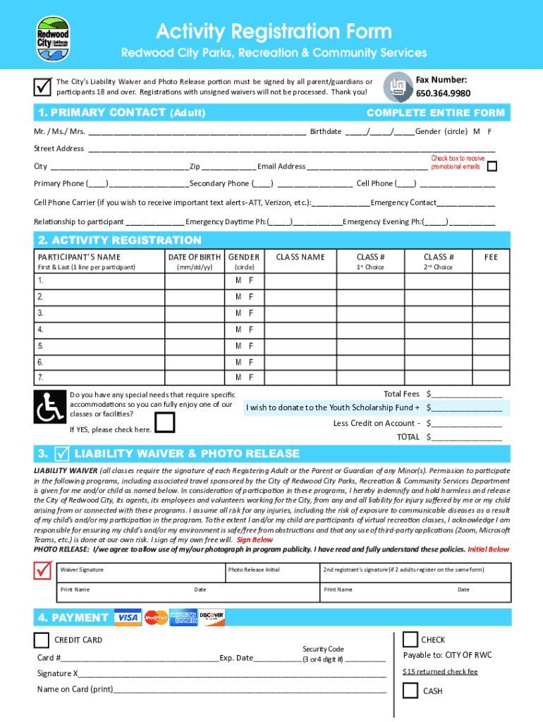 Activity Registration FormRedwood City Parks, Recreation & Community Services Fax Number: 650.364.9980The Citys Liability Waiver and Photo Release portion must be signed by all parent/guardians or
