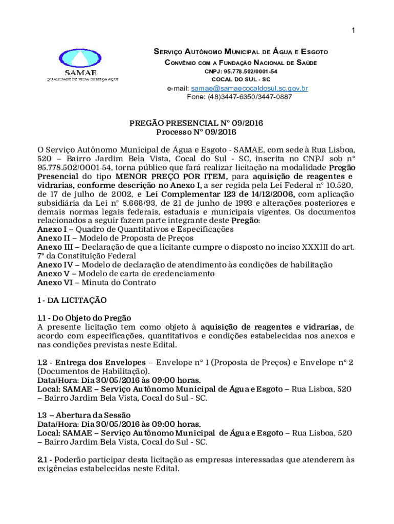 1 SERVIOAUTNOMOMUNICIPALDEGUAEESGOTO CONVNIOCOMAFUNDAONACIONALDESADE CNPJ:95.778.502/000154 COCALDOSULSCemail: samae@ samaecocaldosul.sc.gov.br Fone:(48)34476350/34470887 PREGO PRESENCIAL N 09/2016