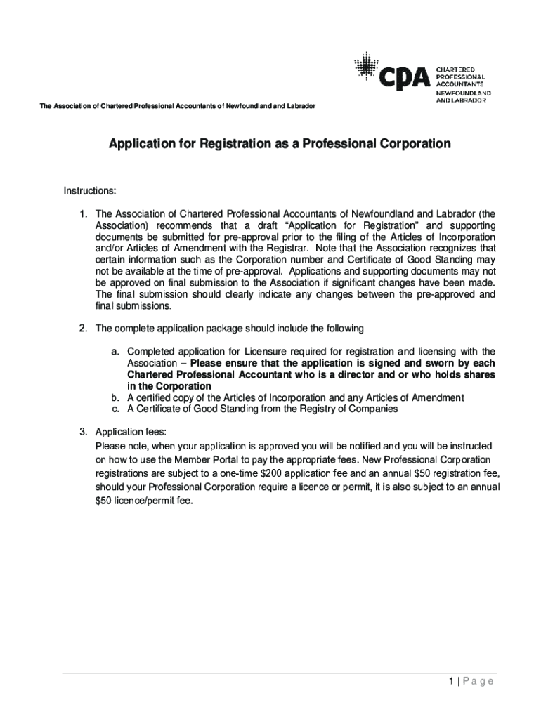 The Association of Chartered Professional Accountants of Newfoundland and LabradorApplication for Registration as a Professional CorporationInstructions: 1. The Association of Chartered Professional