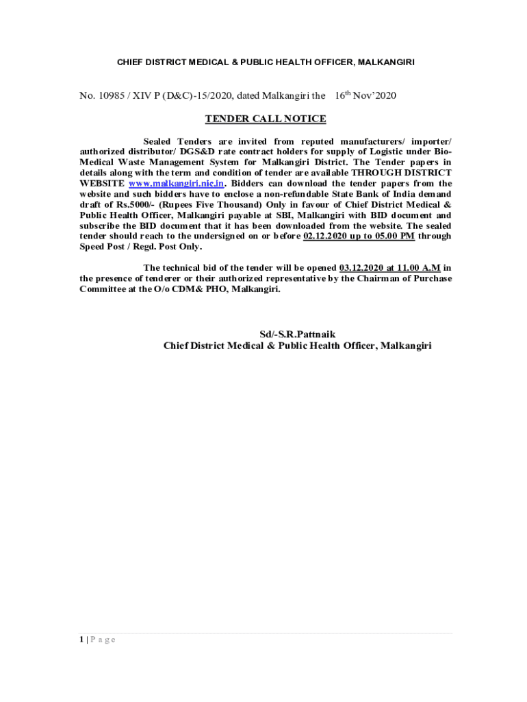 CHIEF DISTRICT MEDICAL & PUBLIC HEALTH OFFICER, MALKANGIRINo. 10985 / XIV P (D&C)15/2020, dated Malkangiri the 16th Nov2020 TENDER CALL NOTICE Sealed Tenders are invited from reputed manufacturers/