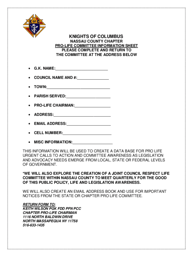 All Knights of Columbus councils are required to file this form to report their pro-life activities.