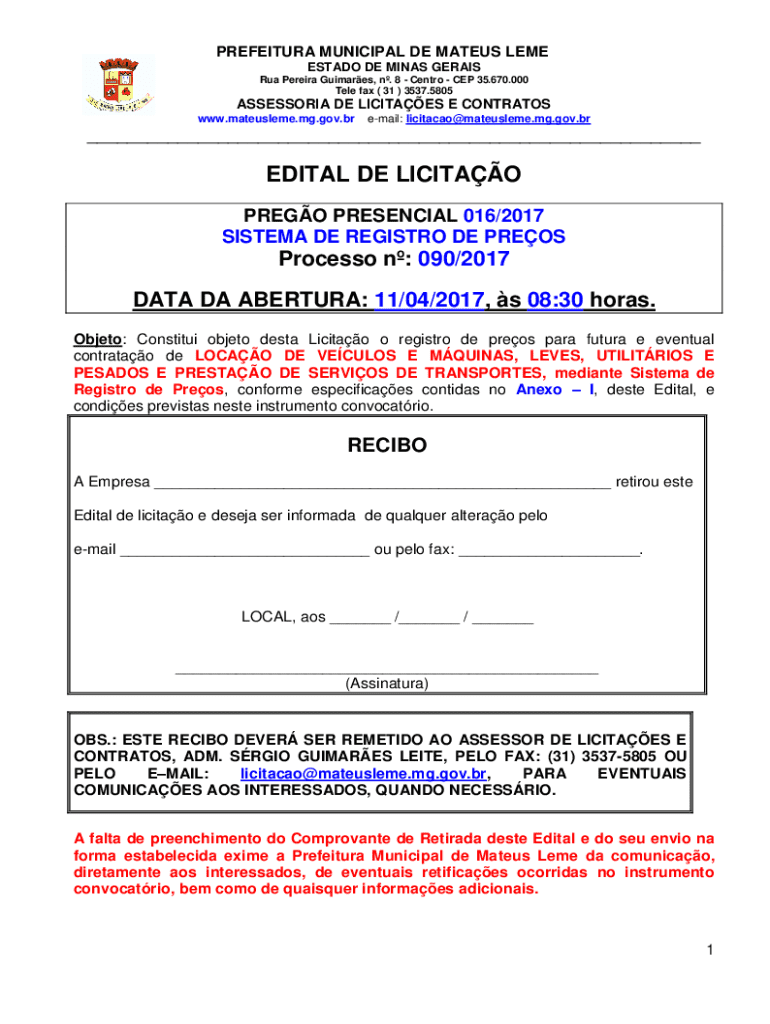 PREFEITURA MUNICIPAL DE MATEUS LEME ESTADO DE MINAS GERAIS Rua Pereira Guimares, n. 8 Centro CEP 35.670.000 Tele fax ( 31 ) 3537.5805ASSESSORIA DE LICITAES E CONTRATOS www.mateusleme.mg.gov.bremail:
