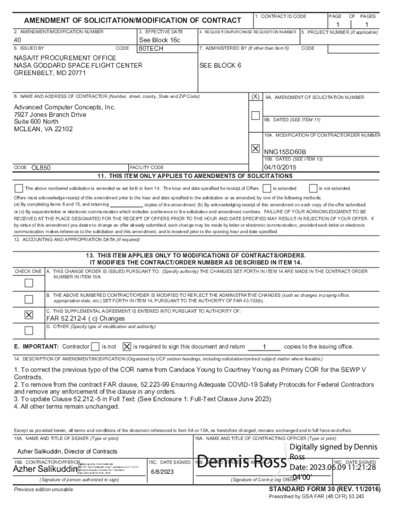 AMENDMENT OF SOLICITATION/MODIFICATION OF CONTRACT 2. AMENDMENT/MODIFICATION NUMBER40 6. ISSUED BYCODE1. CONTRACT ID CODEPAGEOFPAGES113. EFFECTIVE DATE4. REQUISITION/PURCHASE REQUISITION NUMBER5.