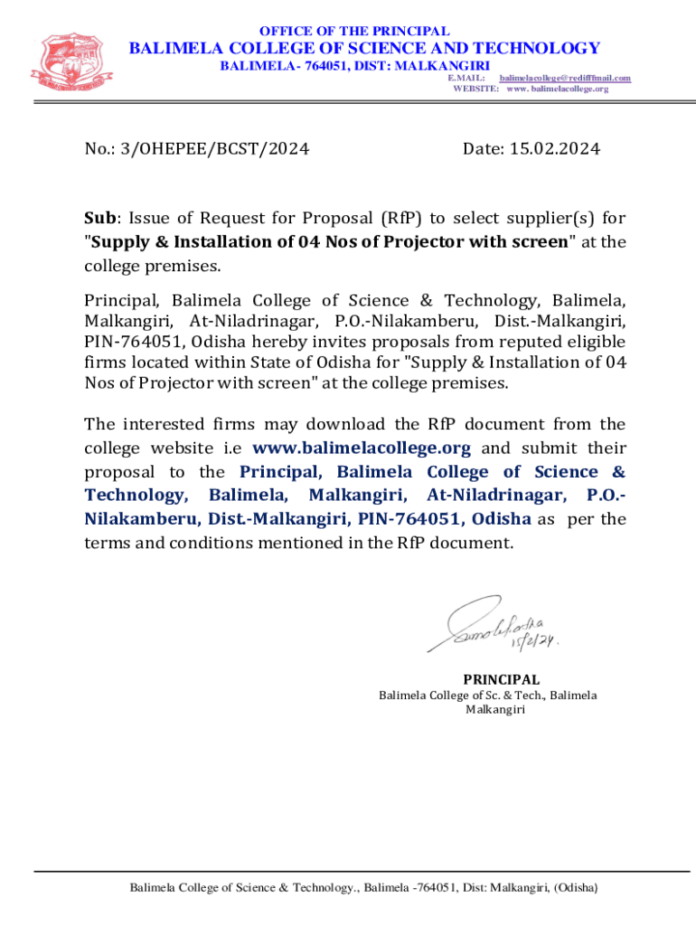 OFFICE OF THE PRINCIPALBALIMELA COLLEGE OF SCIENCE AND TECHNOLOGY BALIMELA 764051, DIST: MALKANGIRI E.MAIL: balimelacollege@redifffmail.com WEBSITE: www. balimelacollege.orgNo.: 3/OHEPEE/BCST/2024Date: