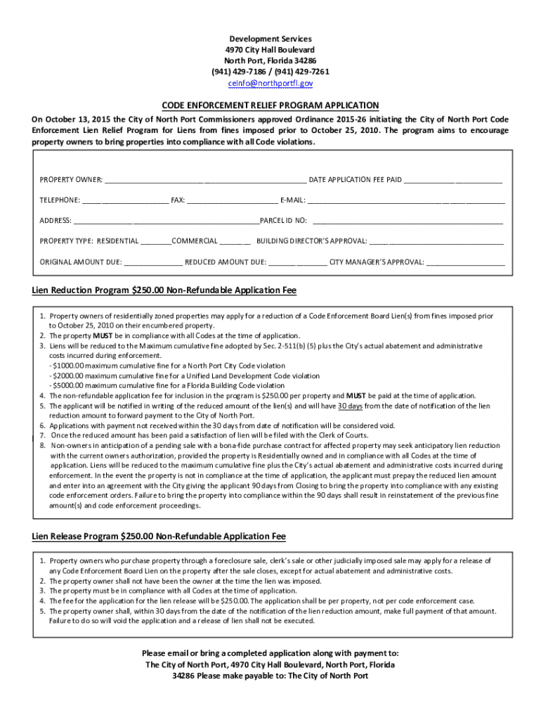Development Services 4970 City Hall Boulevard North Port, Florida 34286 (941) 4297186 / (941) 4297261 ceinfo@northportfl.govCODE ENFORCEMENT RELIEF PROGRAM APPLICATION On October 13, 2015 the City