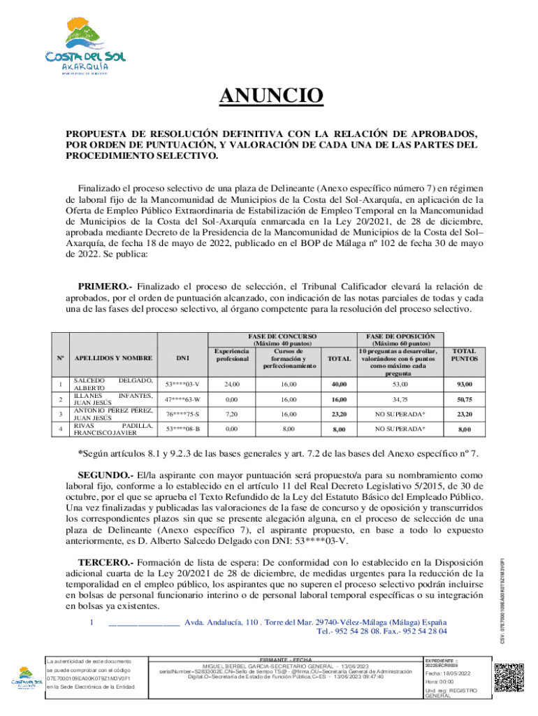 ANUNCIO PROPUESTA DE RESOLUCIN DEFINITIVA CON LA RELACIN DE APROBADOS, POR ORDEN DE PUNTUACIN, Y VALORACIN DE CADA UNA DE LAS PARTES DEL PROCEDIMIENTO SELECTIVO.Finalizado el proceso selectivo de