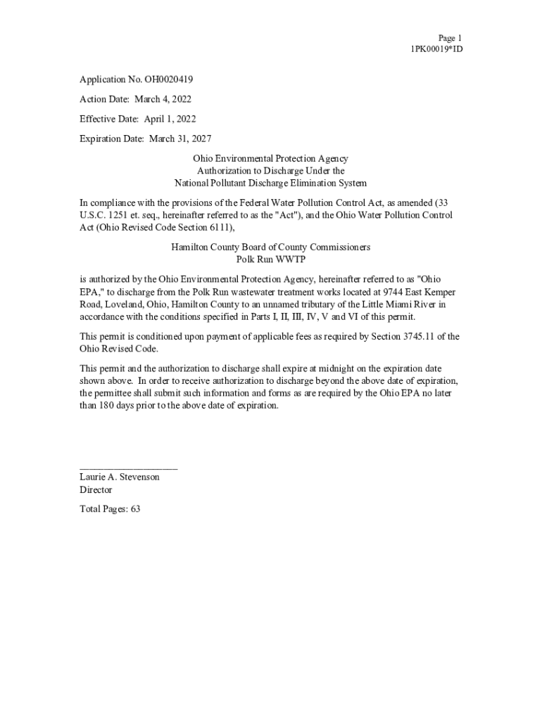 Page 1 1PK00019×IDApplication No. OH0020419 Action Date: March 4, 2022, Effective Date: April 1, 2022, Expiration Date: March 31, 2027 Ohio Environmental Protection Agency Authorization to Discharge