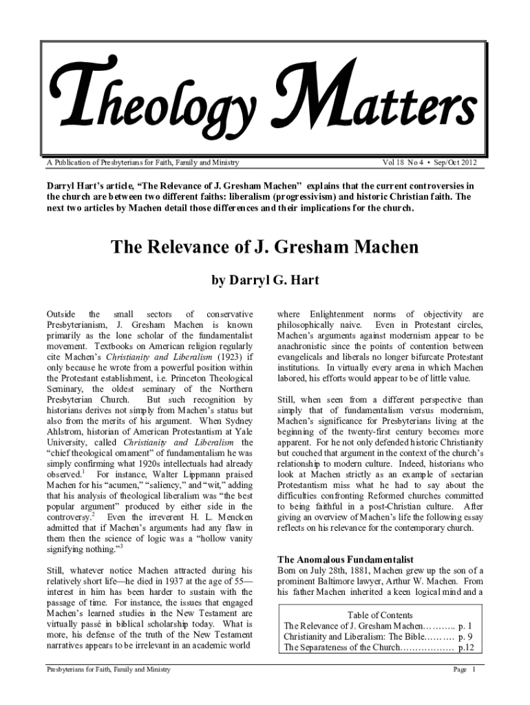 Theology Matters Vol 18 No 4 Sep/Oct 2012A Publication of Presbyterians for Faith, Family and MinistryDarryl Harts article, The Relevance of J. Gresham Machen explains that the current controversies