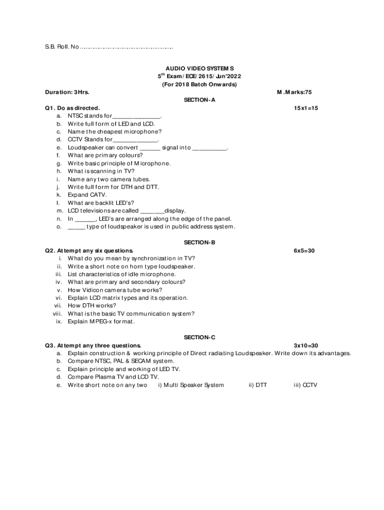 S.B. Roll. No.. AUDIO VIDEO SYSTEMS 5 Exam/ECE/2615/Jun\'2022 (For 2018 Batch Onwards) thDuration: 3Hrs.M.Marks:75SECTIONA Q1. Do as directed. a. NTSC stands for___. b. Write full form of LED and