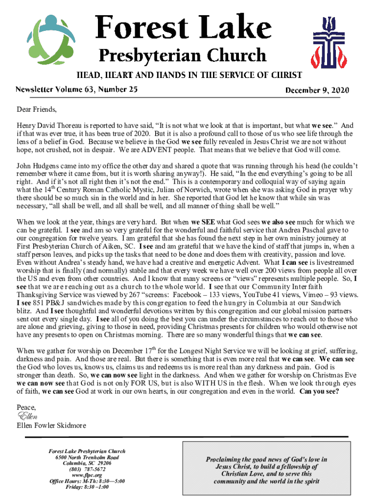 Dear Friends, Henry David Thoreau is reported to have said, It is not what we look at that is important, but what we see. And if that was ever true, it has been true of 2020. But it is also a profound