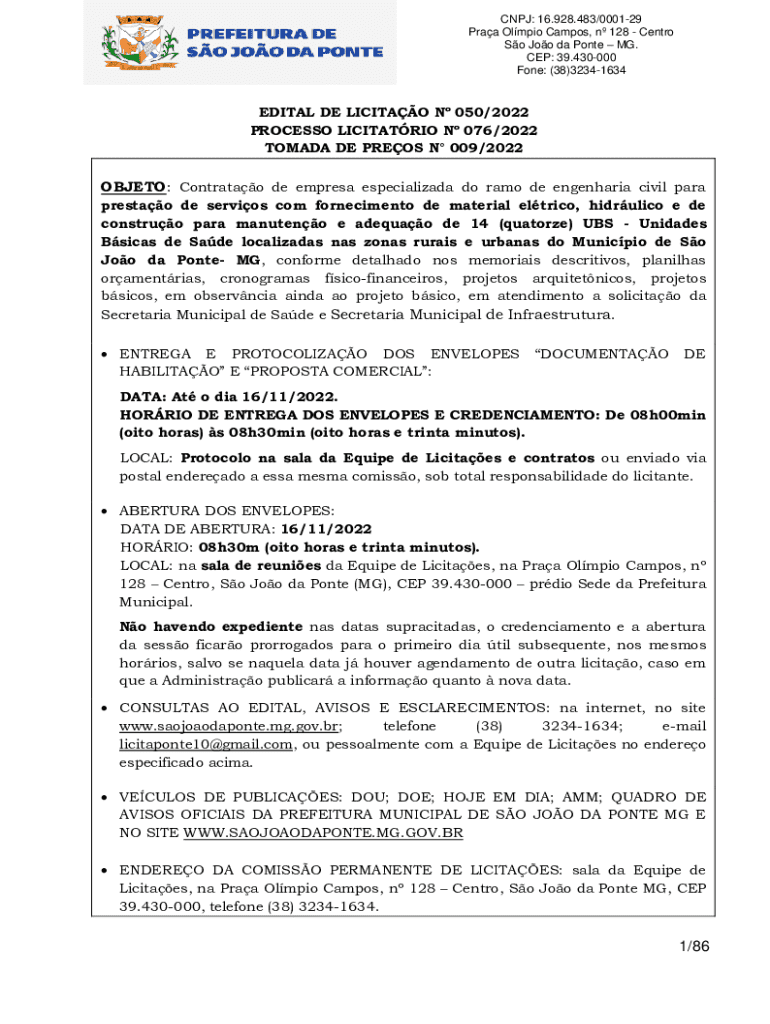 CNPJ: 16.928.483/000129 Praa Olmpio Campos, n 128 Centro So Joo da Ponte MG. CEP: 39.430000 Fone: (38)32341634EDITAL DE LICITAO N 050/2022 PROCESSO LICITATRIO N 076/2022 TOMADA DE PREOS N 009/2022OBJETO: