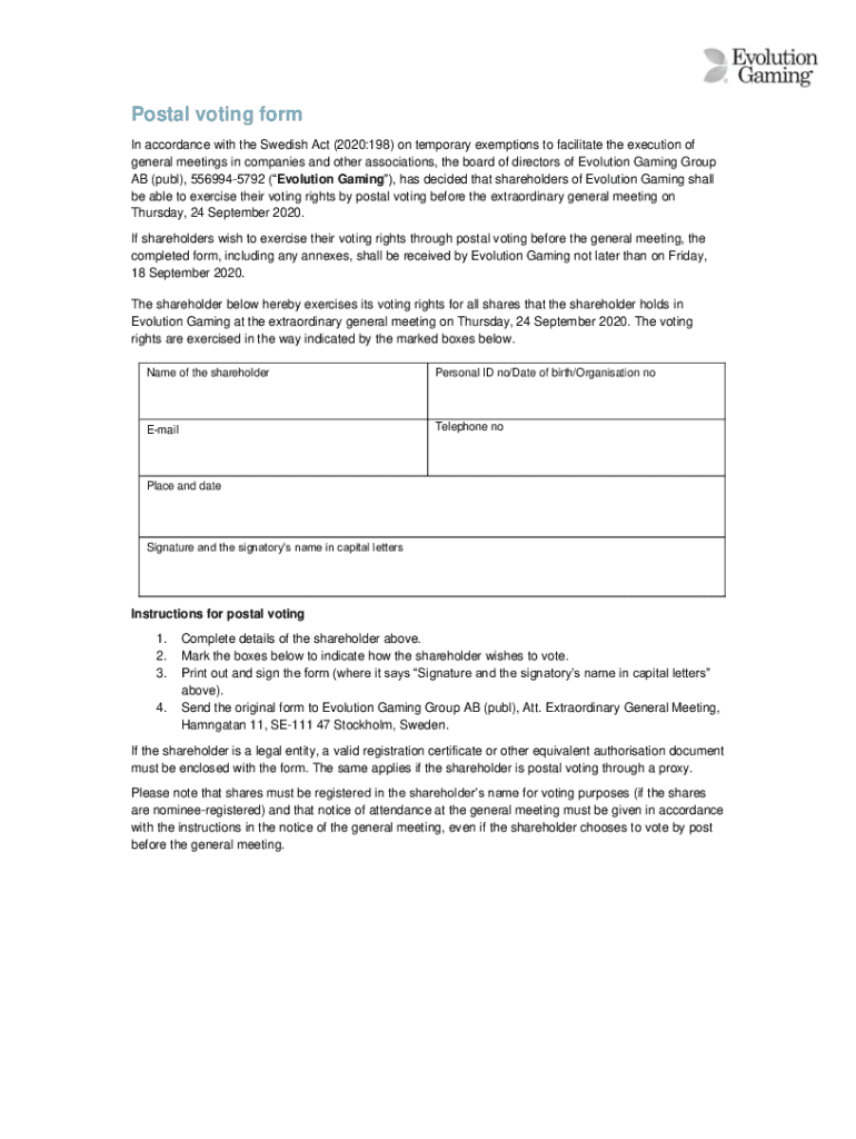 In accordance with the Swedish Act (2020:198) on temporary exemptions to facilitate the execution of