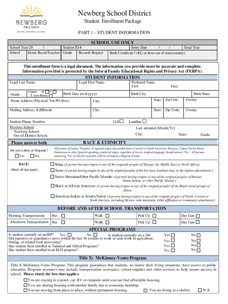 Newberg School District Student Enrollment Package PART 1 STUDENT INFORMATION SCHOOL USE ONLY School Year 20 / Student ID # School Home Room/Teacher Grade Records RequestEntry Date / / Grad Year Birth