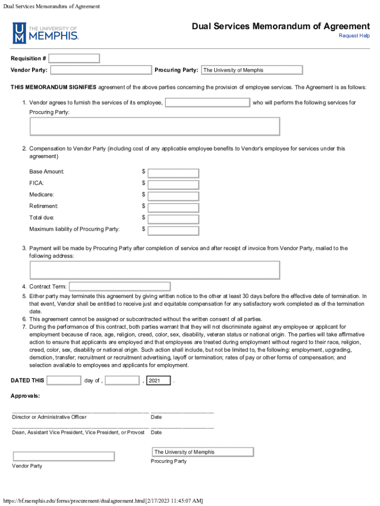 Dual Services Memorandum of AgreementDual Services Memorandum of AgreementRequest HelpRequisition #Vendor Party:Procuring Party:The University of MemphisTHIS MEMORANDUM SIGNIFIES agreement of the