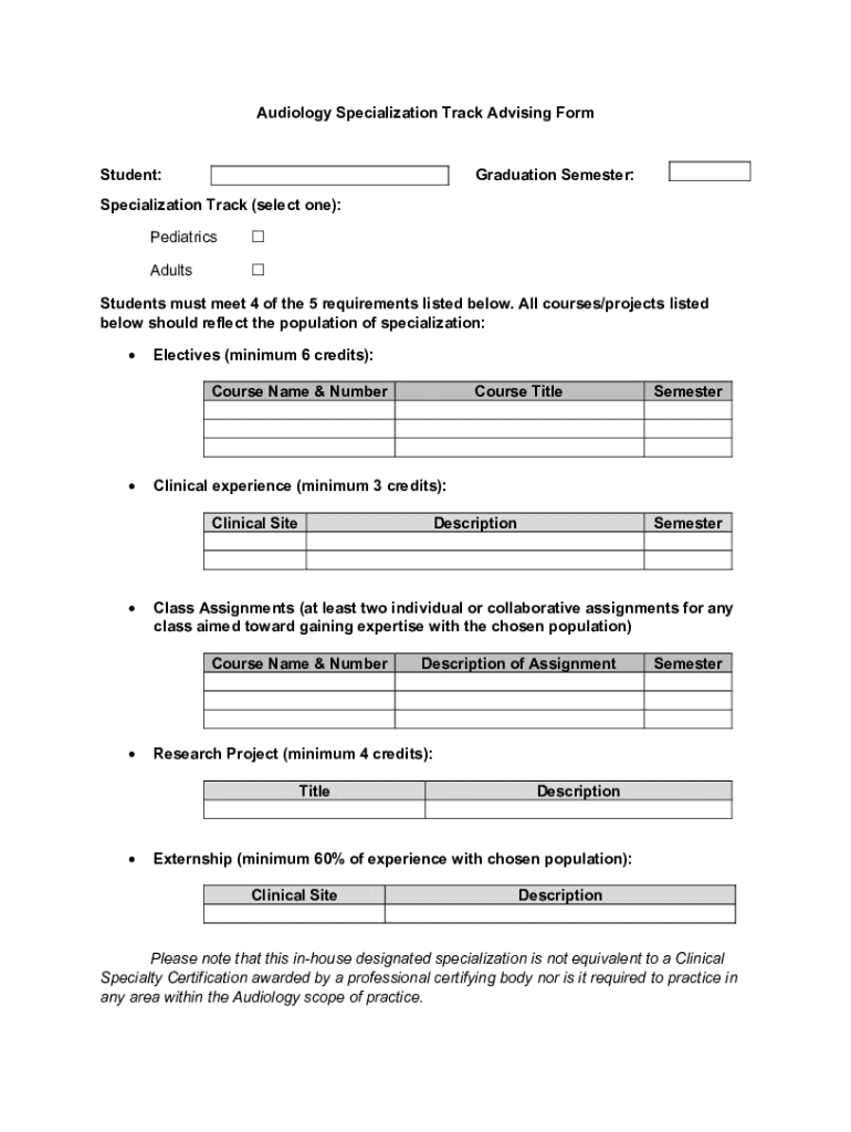 Audiology Specialization Track Advising FormStudent:Graduation Semester:Specialization Track (select one): PediatricsAdultsStudents must meet 4 of the 5 requirements listed below. All courses/projects