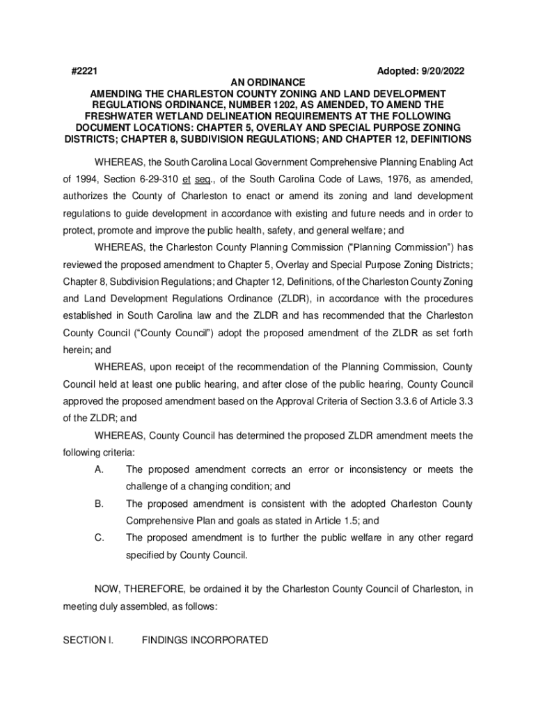 #2221Adopted: 9/20/2022 AN ORDINANCE AMENDING THE CHARLESTON COUNTY ZONING AND LAND DEVELOPMENT REGULATIONS ORDINANCE, NUMBER 1202, AS AMENDED, TO AMEND THE FRESHWATER WETLAND DELINEATION REQUIREMENTS