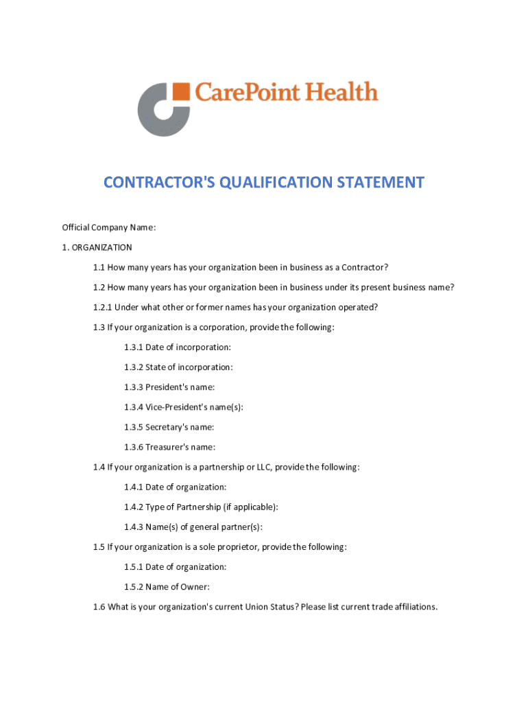 CONTRACTOR\'S QUALIFICATION STATEMENT Official Company Name: 1. ORGANIZATION 1.1 How many years has your organization been in business as a Contractor? 1.2 How many years has your organization been