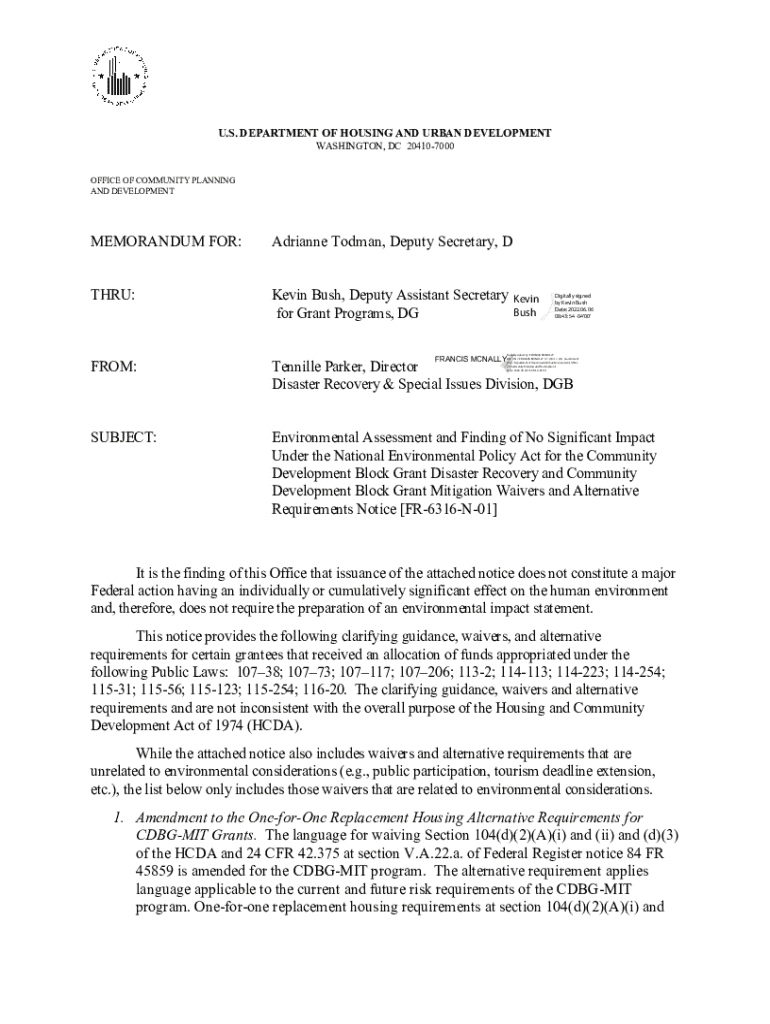 AND DEVELOPMENTMEMORANDUM FOR:Adrianne Tod man, Deputy Secretary, THRU:Kevin Bush, Deputy Assistant