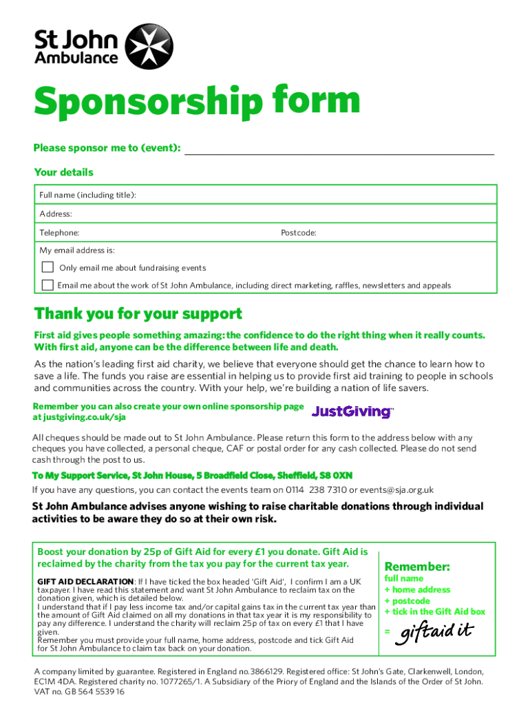 Sponsorship form Please sponsor me to (event): Your details Full name (including title): Address: Telephone:Postcode:My email address is: Only email me about fundraising events Email me about the