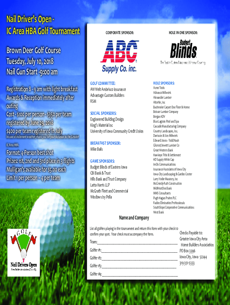 Nail Drivers Open IC Area HBA Golf TournamentCORPORATE SPONSOR:HOLE IN ONE SPONSOR:Brown Deer Golf Course Tuesday, July 10, 2018 Nail Gun Start 9:00 am Registration 8 9 am with light breakfast Awards