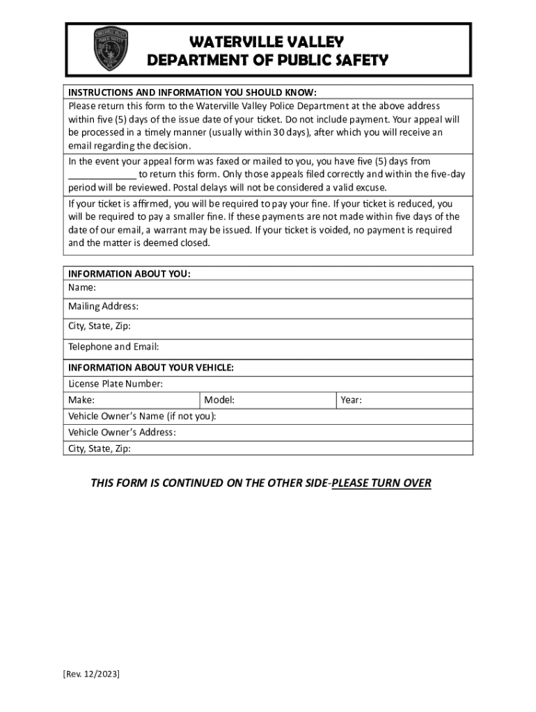 NH Parking Ticket Appeal Form - Town of Waterville Valley 2023-2026 free printable template
