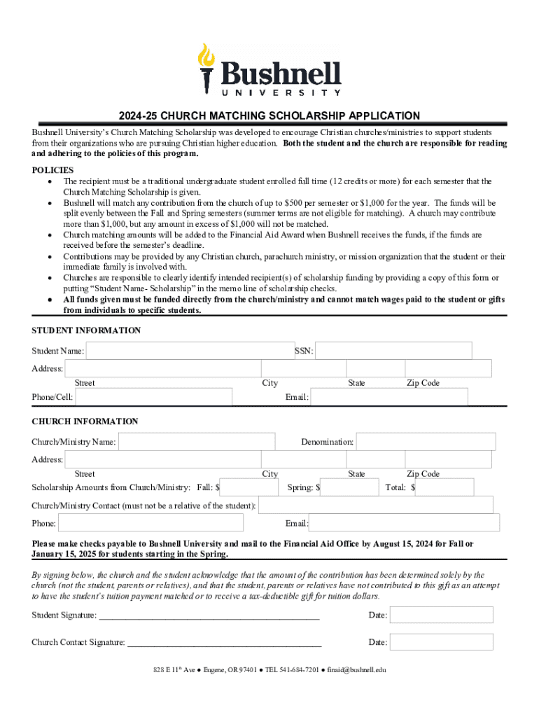 202425 CHURCH MATCHING SCHOLARSHIP APPLICATION Bushnell Universitys Church Matching Scholarship was developed to encourage Christian churches/ministries to support students from their organizations