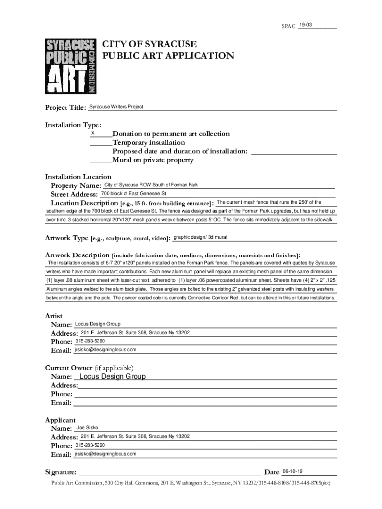 To fill out public art installations, one must complete the designated forms provided by local or regional authorities, detailing the artist, location, materials used, funding sources, and project specifics.
