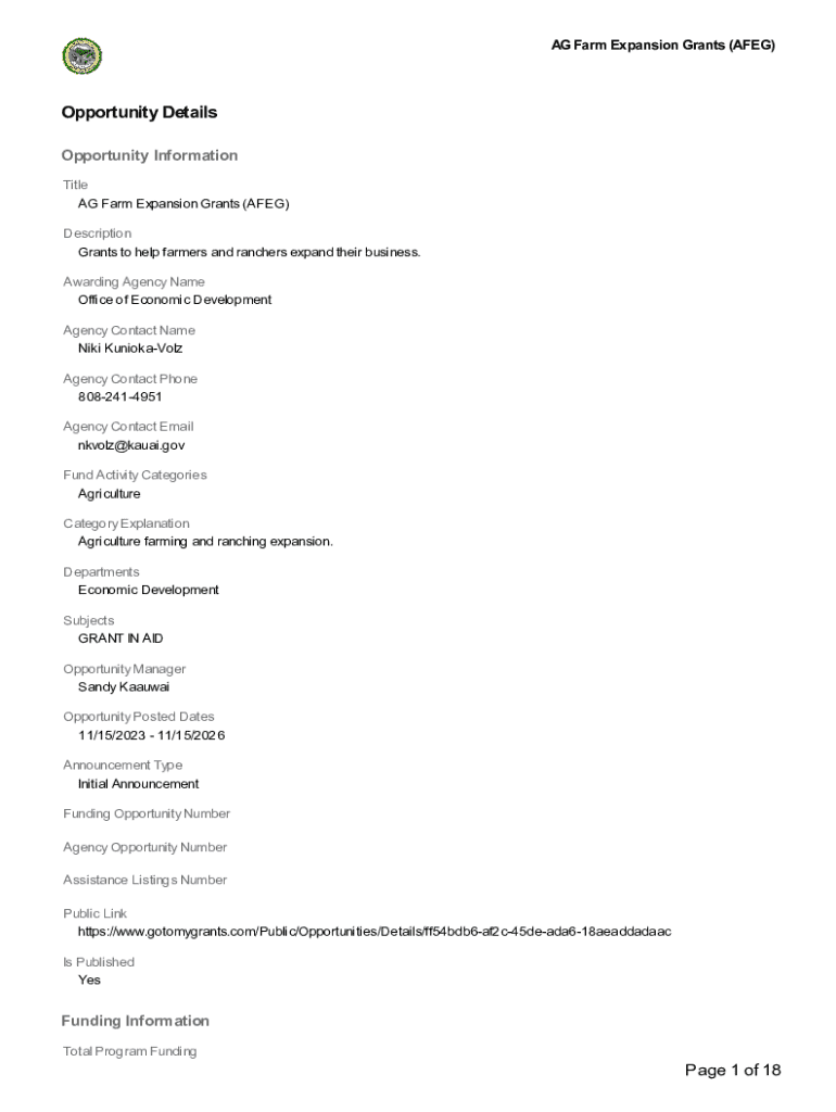 AG Farm Expansion Grants (AEG)Opportunity Details