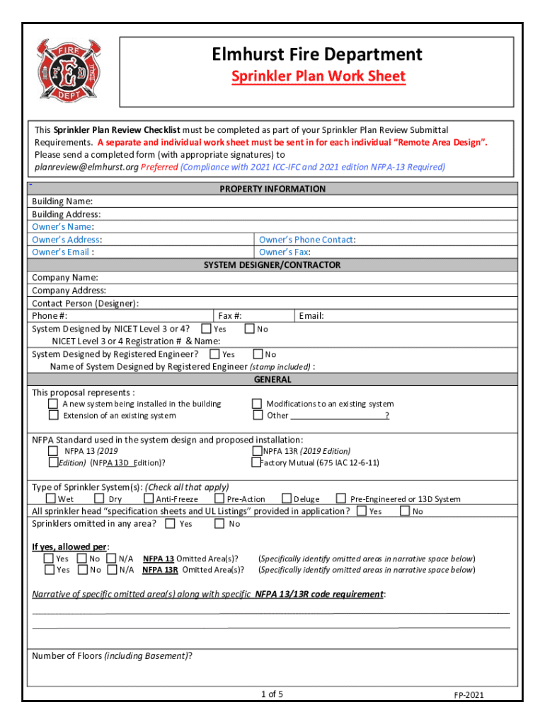 Elmhurst Fire Department Sprinkler Plan Work Sheets Sprinkler Plan Review Checklist must be completed as part of your Sprinkler Plan Review Submittal Requirements. A separate and individual work sheet