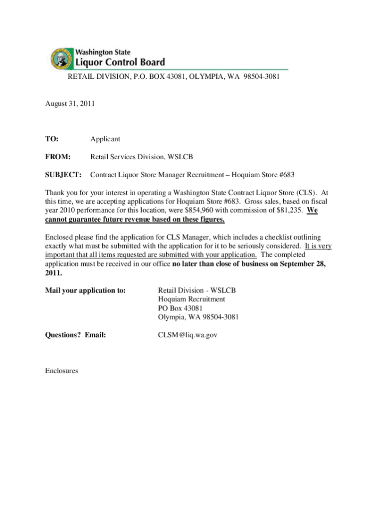 RETAIL DIVISION, P.O. BOX 43081, OLYMPIA, WA 985043081August 31, 2011TO:ApplicantFROM:Retail Services Division, WSLCBSUBJECT:Contract Liquor Store Manager Recruitment Requiem Store #683Thank you for
