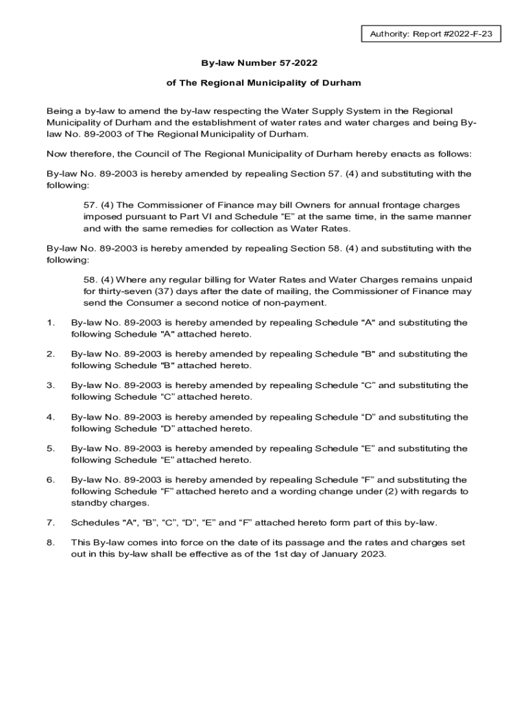 Authority: Report #2022F23DBylaw Number 572022 of The Regional Municipality of Durham Being a bylaw to amend the bylaw respecting the Water Supply System in the Regional Municipality of Durham and