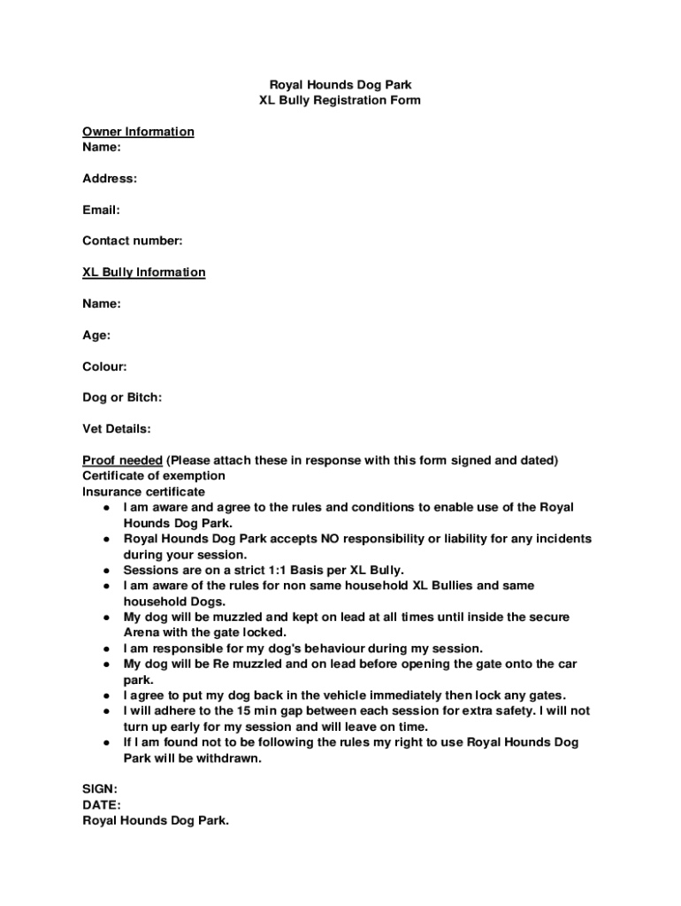 Get the free Royal Hounds Dog Park XL Bully Registration Form Owner ...