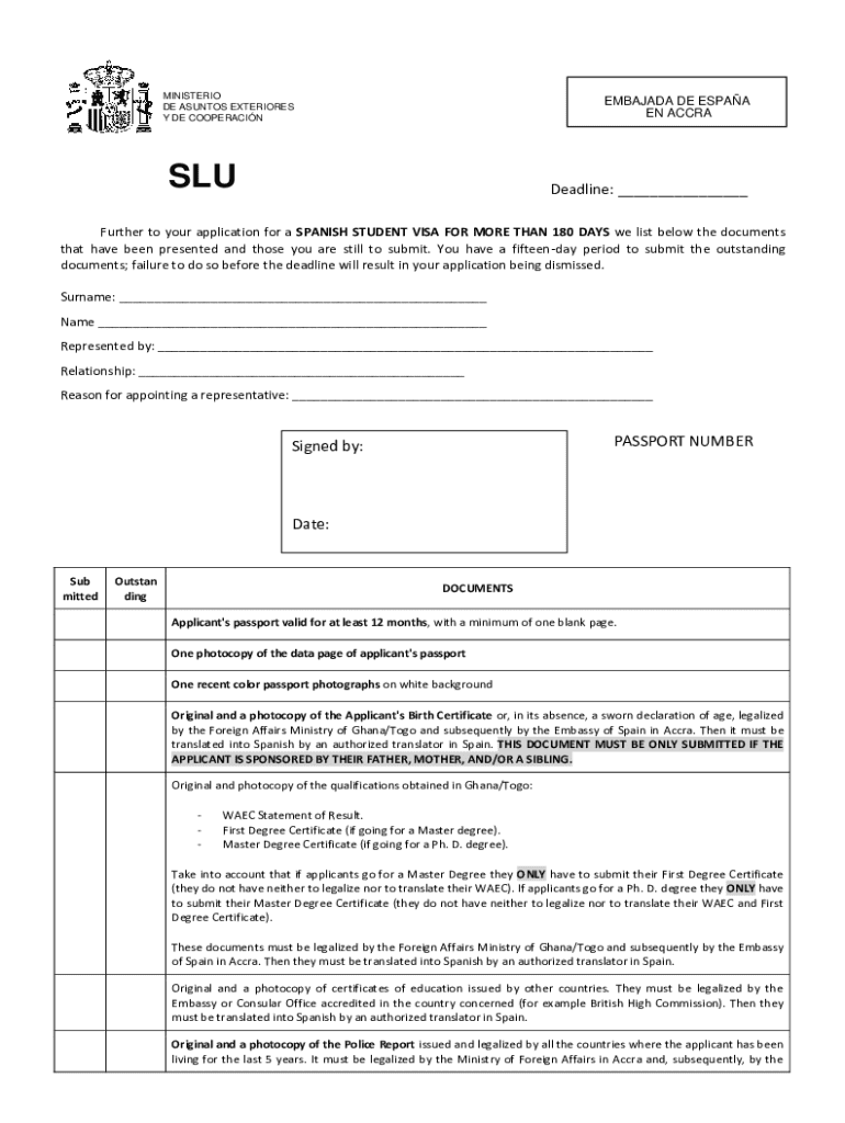 MINISTER DE SANTOS EXTERIORS Y DE COOPERACINEMBAJADA DE ESAA EN ACCRASLUDeadline: ___Further to your application for a SPANISH STUDENT VISA FOR MORE THAN 180 DAYS we list below the documents that