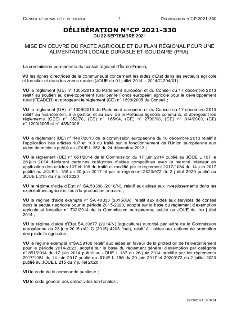 DU 22 SEPTEMBER 2021MISE EN OEUVRE DU PACTE AGRICOLA ET DU PLAN REGIONAL POUR ONE