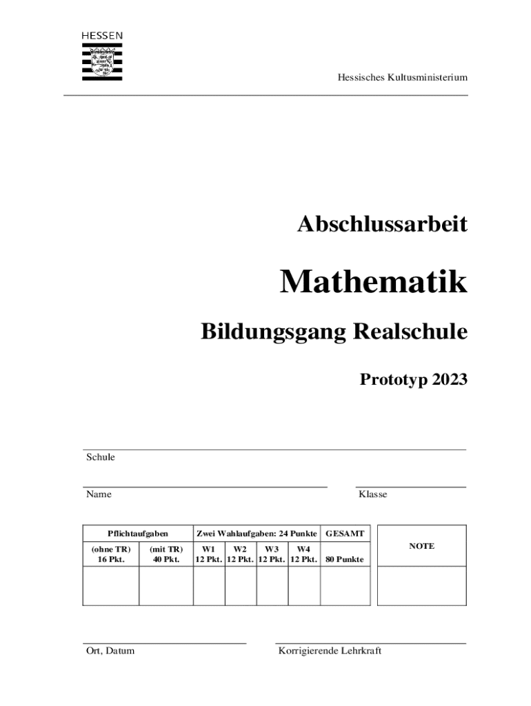 Hessisches KultusministeriumAbschlussarbeitMathematik Bildungsgang Realschule Prototyp 2023SchuleNameKlassePflichtaufgaben (ohne TR) 16 Pkt.Ort, Datum(mit TR) 40 Pkt.Zwei Wahlaufgaben: 24 PunkteGESAMTW1