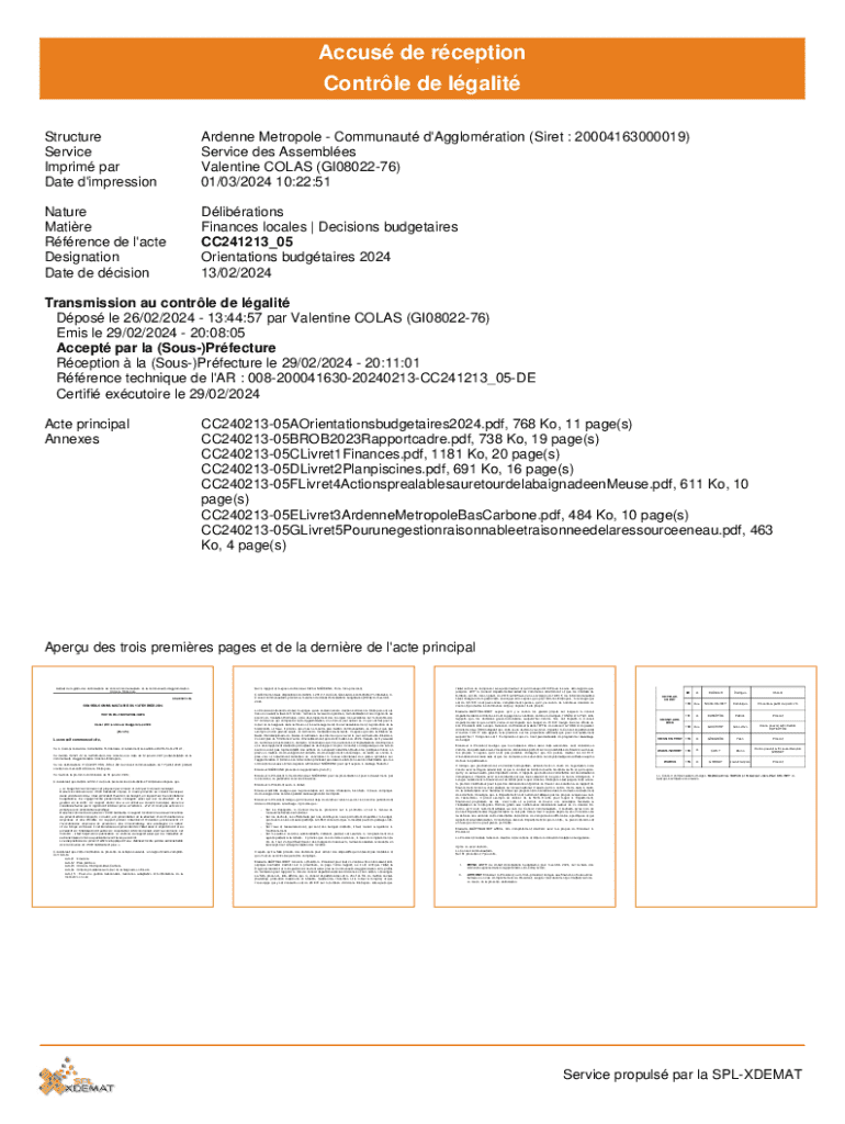 Accus de rception Contrle de lgalit Structure Service Imprim par Date d\'impressionArdenne Metropole Communaut d\'Agglomration (Siret : 20004163000019) Service des Assembles Valentine COLAS (GI0802276)