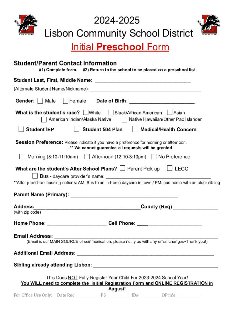 20242025 Lisbon Community School District Initial Preschool Form Student/Parent Contact Information #1) Complete form.#2) Return to the school to be placed on a preschool listStudent Last, First,