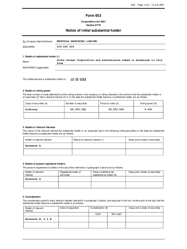 603Page 1 of 2 15 July 2001Form 603 Corporations Act 2001 Section 671BNotice of initial substantial holder To Company Name/SchemeWESTGOLD RESOURCES LIMITEDACN/ARSN009 260 3061. Details of substantial