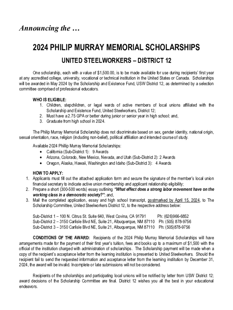 Announcing the 2024 PHILIP MURRAY MEMORIAL SCHOLARSHIPS UNITED STEELWORKERS DISTRICT 12 One scholarship, each with a value of $1,500.00, is to be made available for use during recipients first year