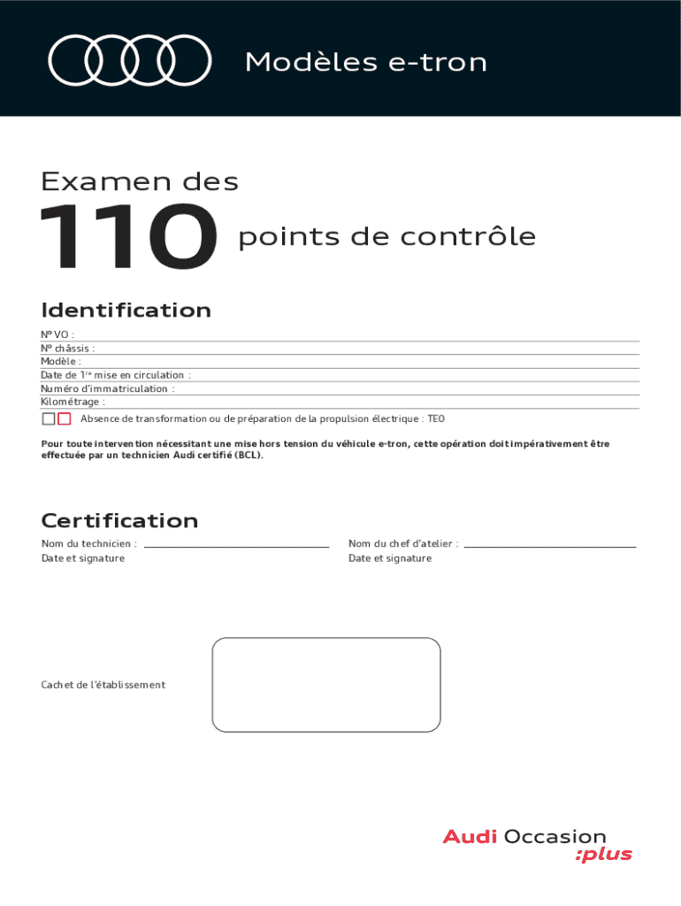 Modles etronExamen des110points de contrleIdentification N VO : N chssis : Modle : Date de 1re mise en circulation : Numro dimmatriculation : Kilomtrage : Absence de transformation ou de prparation